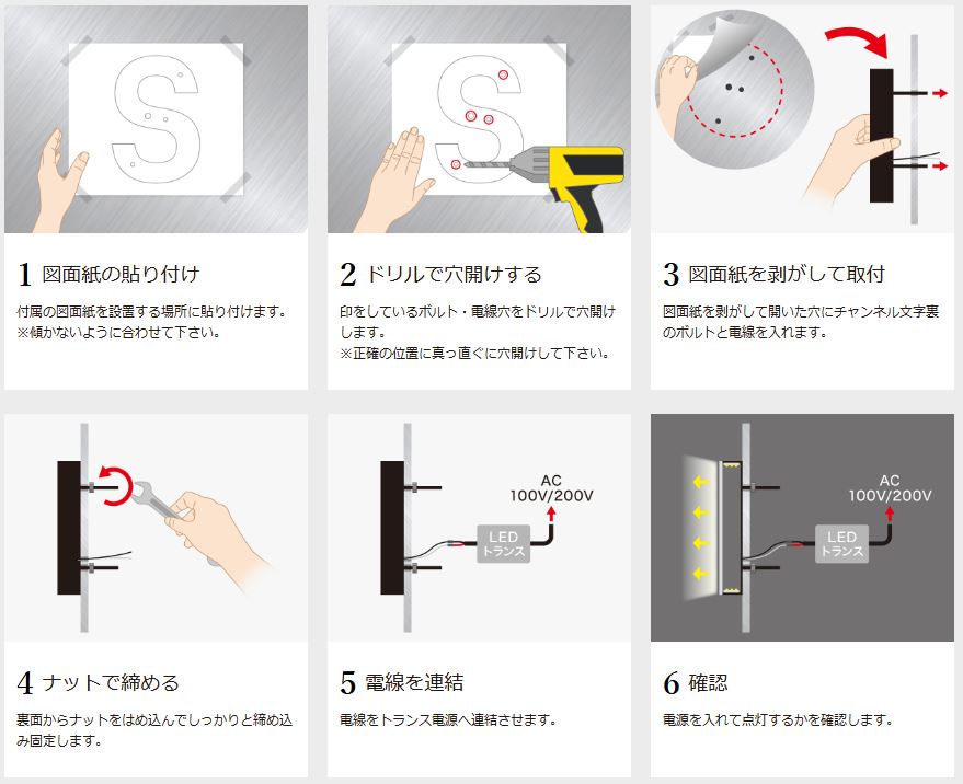 付属のスペーサー(パイプ)を使って均一な浮かしを簡単に実現。壁との隙間からもれる美しい光が、スマートな看板文字をさらに際立たせます。